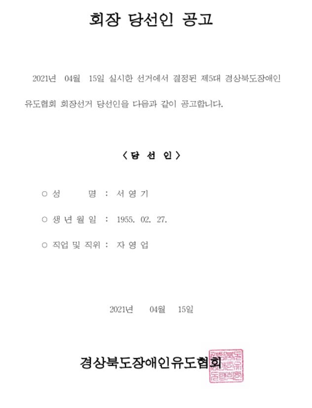 경상북도장애인유도협회 회장 당선인 공고의 건 kjfd 0 12361 2021.04.16 15:11 2021.04.16 15:11 경상북도장애인유도협회 제5대 회장 당선인 공고.pdf (77.0K) + 2687 경상북도장애인유도협회 제5대 회장 당선인 공고입니다.※ 첨부파일 확인해주세요.